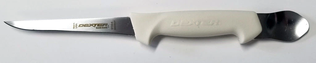 The Dexter S133-6 w/spoon 6″ Cut & Gut knife is famous for it’s white Sani-Safe handle. This is the knife every one tries to copy but can’t come close to our durability, edge holding ability and performance. This knife features our Sani-Safe handle, our proprietary High Carbon, High Alloy, Stain free DEXSTEEL blade, and stainless steel gutting spoon. The Sani-Safe handle gives you great control and the ultra sharp blade makes filleting and gutting easy. This knife is NSF certified. This Cut & Gut knife is available in 4″ and 6″ lengths. Made in U.S.A.