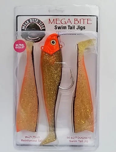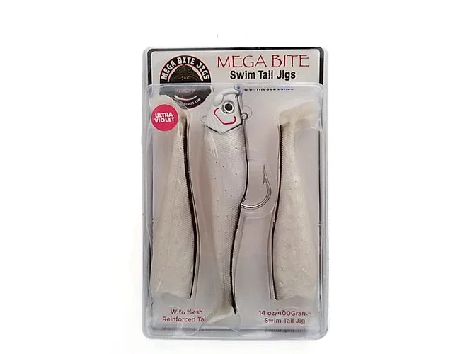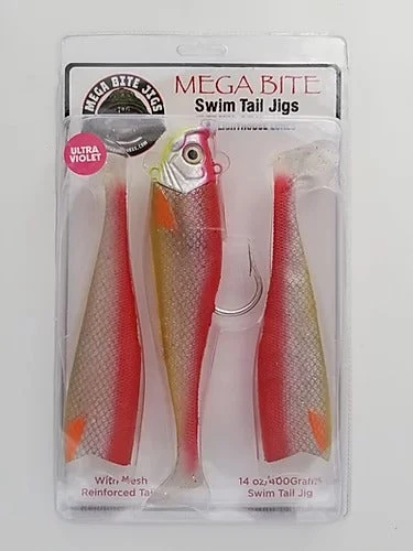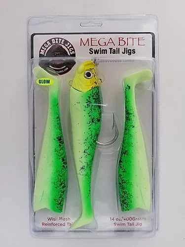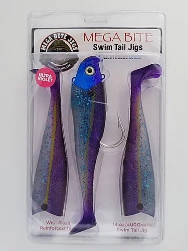 The Mega Bite swim tail jigs are deep drop swim tail jigs with amazing swimming action for all types of bottom fish. Tails are reinforced with mesh and are extremely durable. These are 14 ounce/ 400 gram jigs and come with 3 tails and 1 jig head.