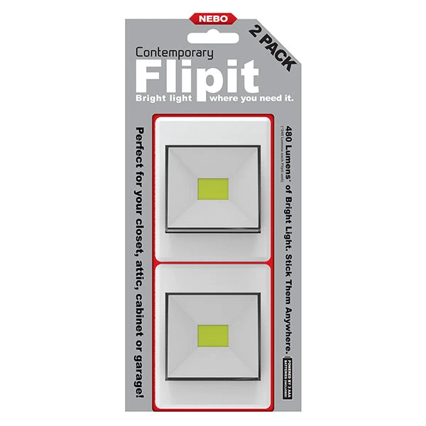 The NEBO® Contemporary Flipit is a 240 lumen C•O•B LED light that operates like a standard household light rocker switch. Flipit includes hook & loop double-sided tape and 2 magnets for two easy mounting options, as well as a drywall screw hole for permanent mounting. The Flipit is powered by 3 AAA batteries (included).