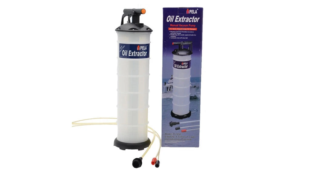 Pela’s original pump, since 1996. A long time favourite among technicians because of its power and durability. Requires just 4 to 15 strokes in a row to create a powerful vacuum. The integrated container (6.5 litres) then neatly captures the oil preventing messy spills. The see-through, calibrated container lets the user know how much oil has been extracted. A built-in float switch automatically stops extraction as soon as capacity is reached. A pour spout facilitates emptying. With the pump housed inside the container, the Big PELA is a durable, maintenance free unit.Â