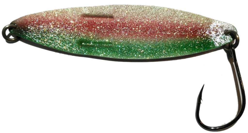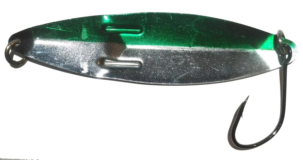 This spoon size no 3 is a clone of the Kipple K spoon. To this collection, we have added size no 4 and no 6. The #6 TKO spoon is popular with the sports sector for catching Chinooks and Cohoes. There are 10 popular colours in addition to the metal finishes for sports fishing. The weight of the size no 3 spoon is similar to Silver Horde’s Lite Bite.