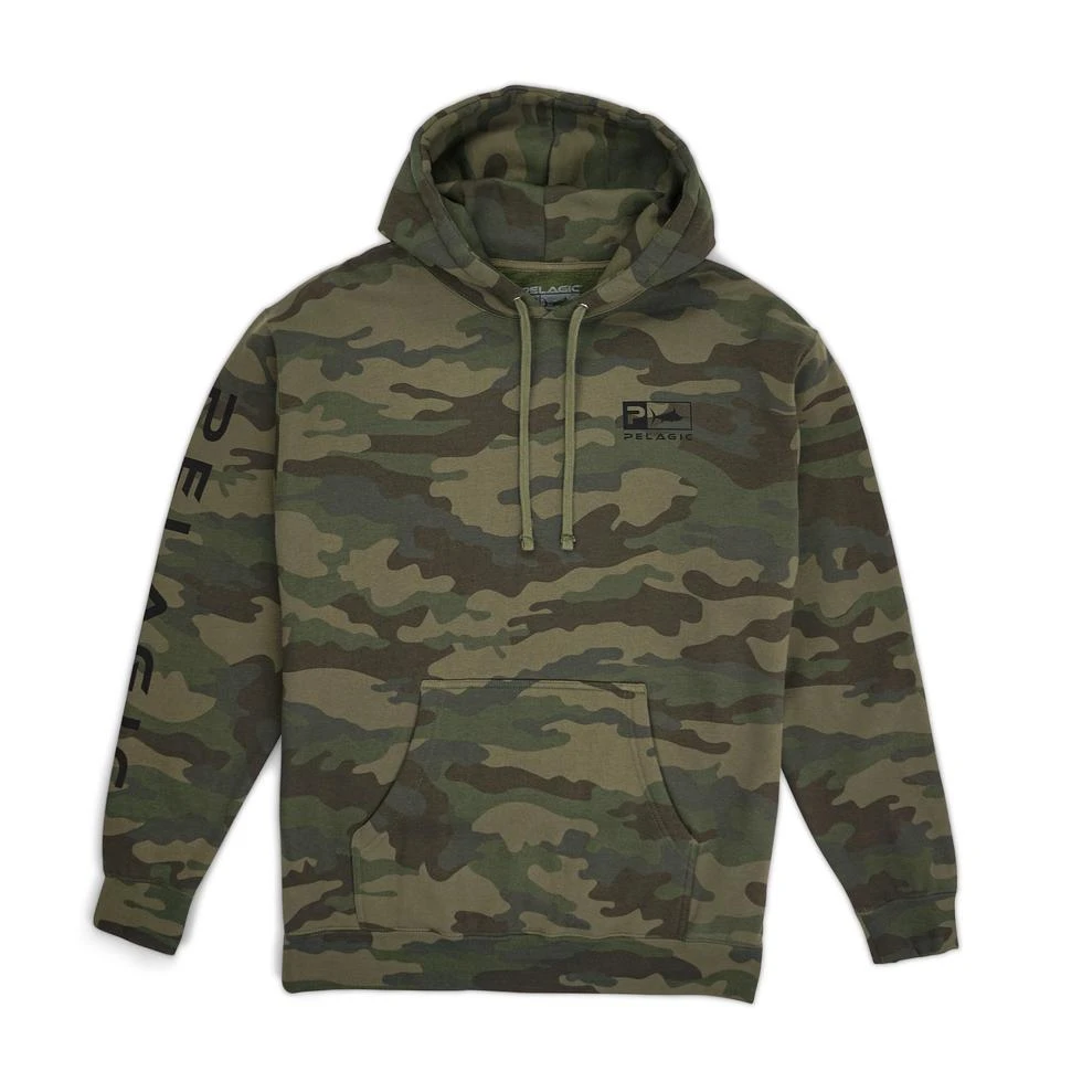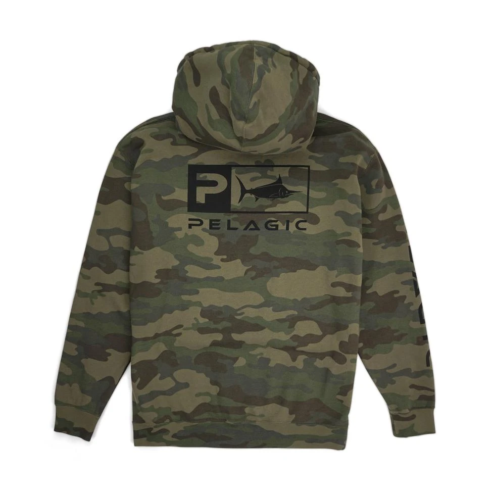 The Pelagic Icon Hoodie offers an updated Pelagic logo design on forrest camo pullover hoody with front and back Icon logos. The perfect solution for those crisp days.Â