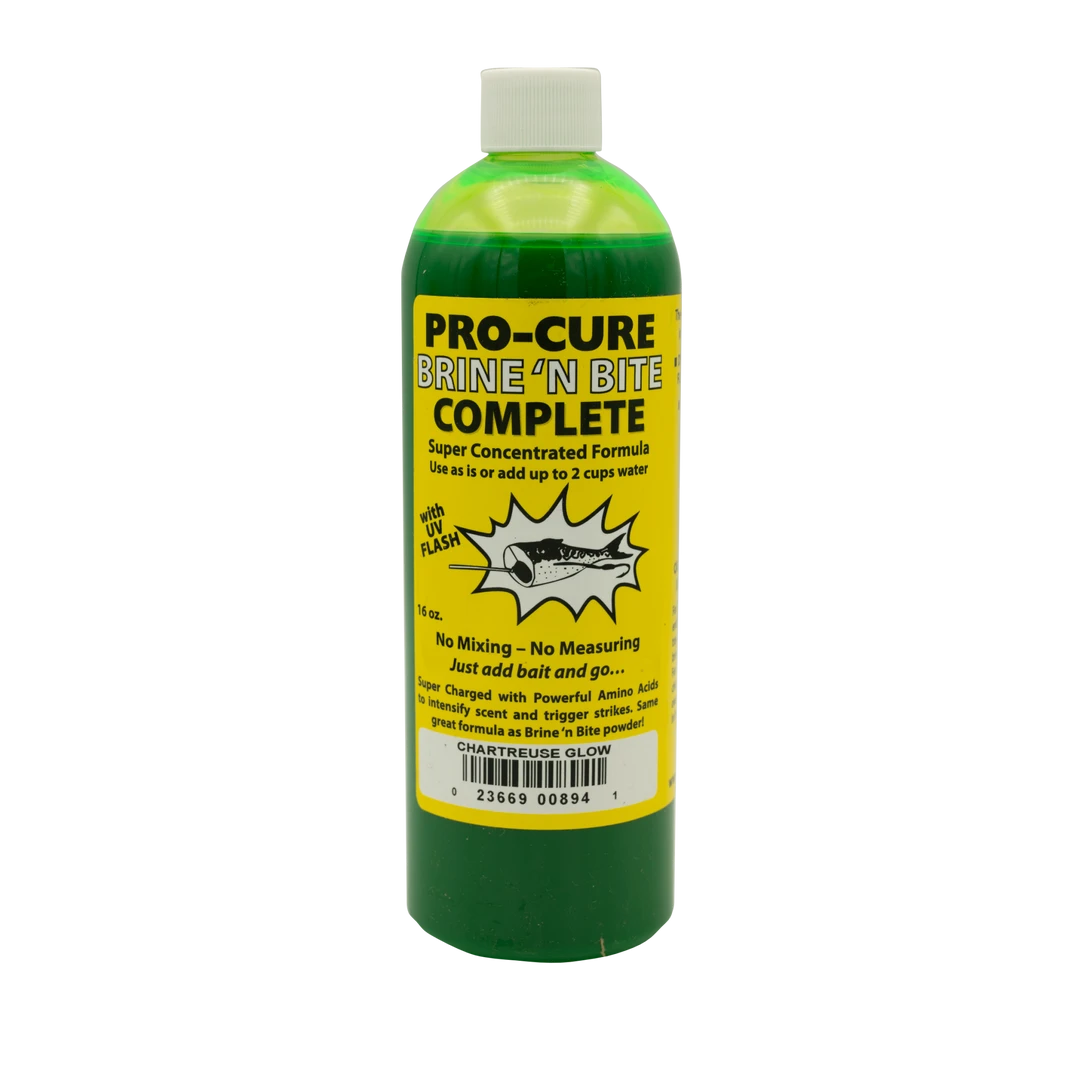The same great formula as our legendary Brine ‘n Bite Powder, without all the hassles of measuring powder, water, dyes, UV and brighteners. Brine ‘n Bite Complete has it all! The Chartreuse Glow, and Brilliant Blue have the perfect amounts of dyes to give you brilliant, fluorescent colored baits, with UV added. And all the liquids contain our proprietary blend of amino acids to trigger aggressive strikes. So if you’re just doing a few trays of bait, save all the hassles and grab a bottle or two of Brine ‘n Bite Complete.