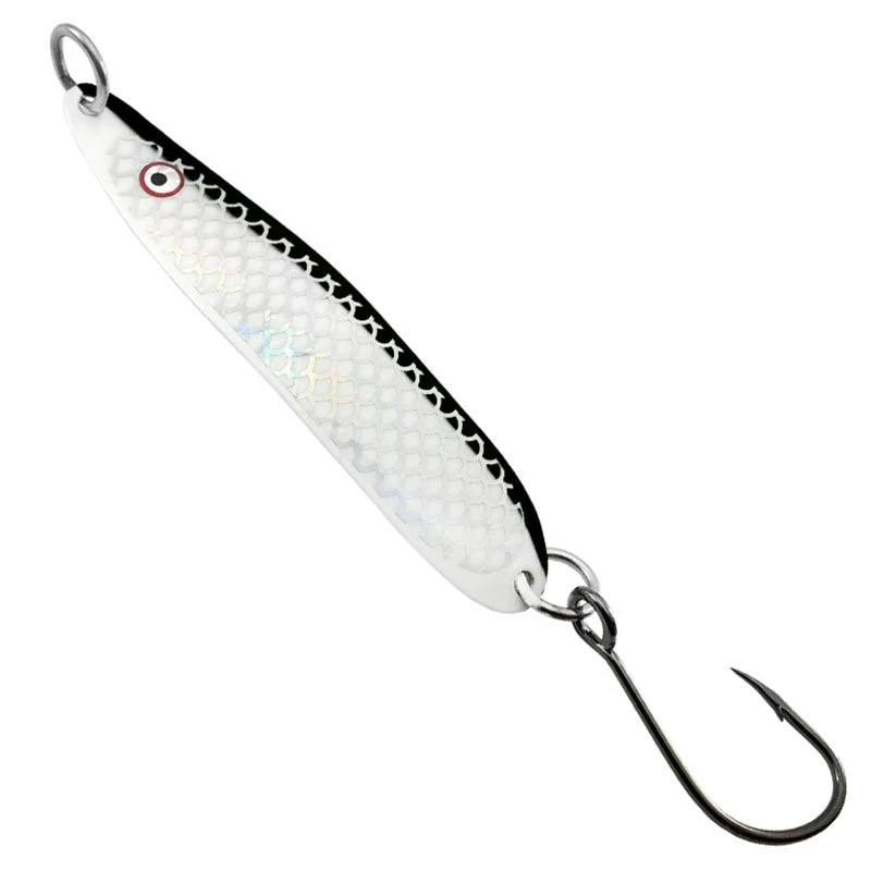 The Gibbs Skinny G is a light weight trolling spoon. It mimics small bair fish and has an erratic wounded action that changes frequently. It features a lifelike eye, welded rings and a Mustad Ultra Point Hook. The Skinny G is available in Glow or Nickel finishes with 13 vibrant colours. The spoon is 1/4oz and can be trolled at speeds from 2mph and faster.