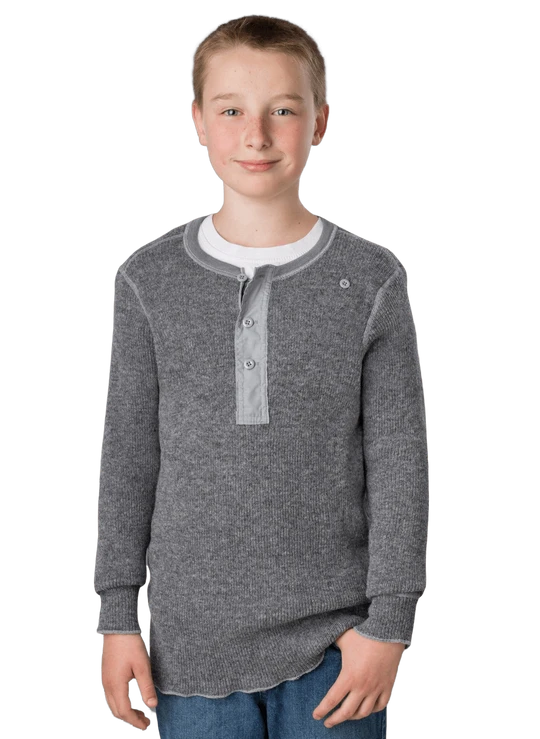 Our famous wool henley is now available in youth sizing. Modelled after the much loved adult version, it is made of 80% wool, 20% nylon. This shirt features a double front, military insert shoulders and a 3 button placket with an extra button for securing the neck open.
